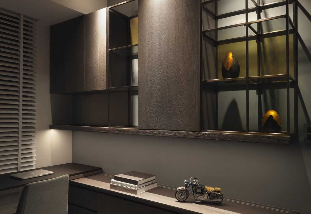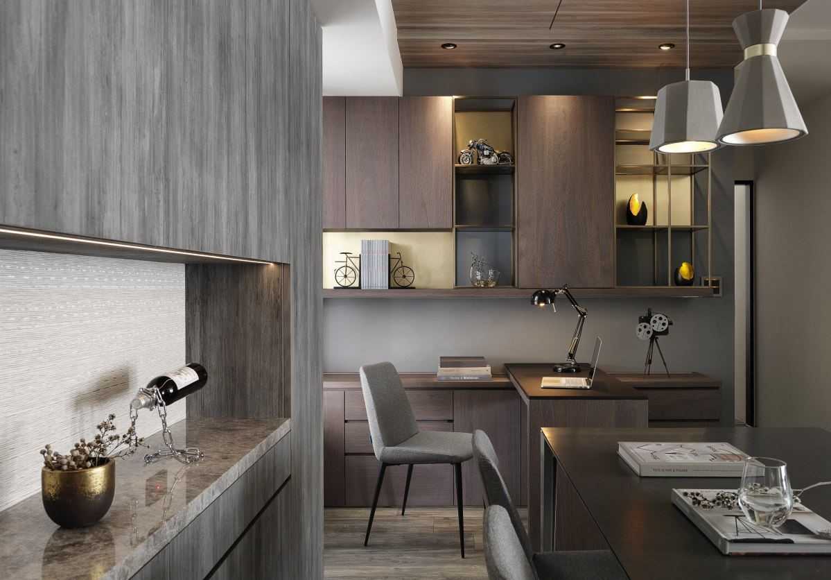 公領(lǐng)域依據(jù)屋主生活習(xí)慣,增設(shè)一開放式書房,平行餐桌的鋪排讓視線及生活動(dòng)線更加利落、順暢,在餐桌與書房區(qū)之間設(shè)計(jì)的活動(dòng)式幕簾,讓開放式書房也能享有與世隔絕的專心氛圍。