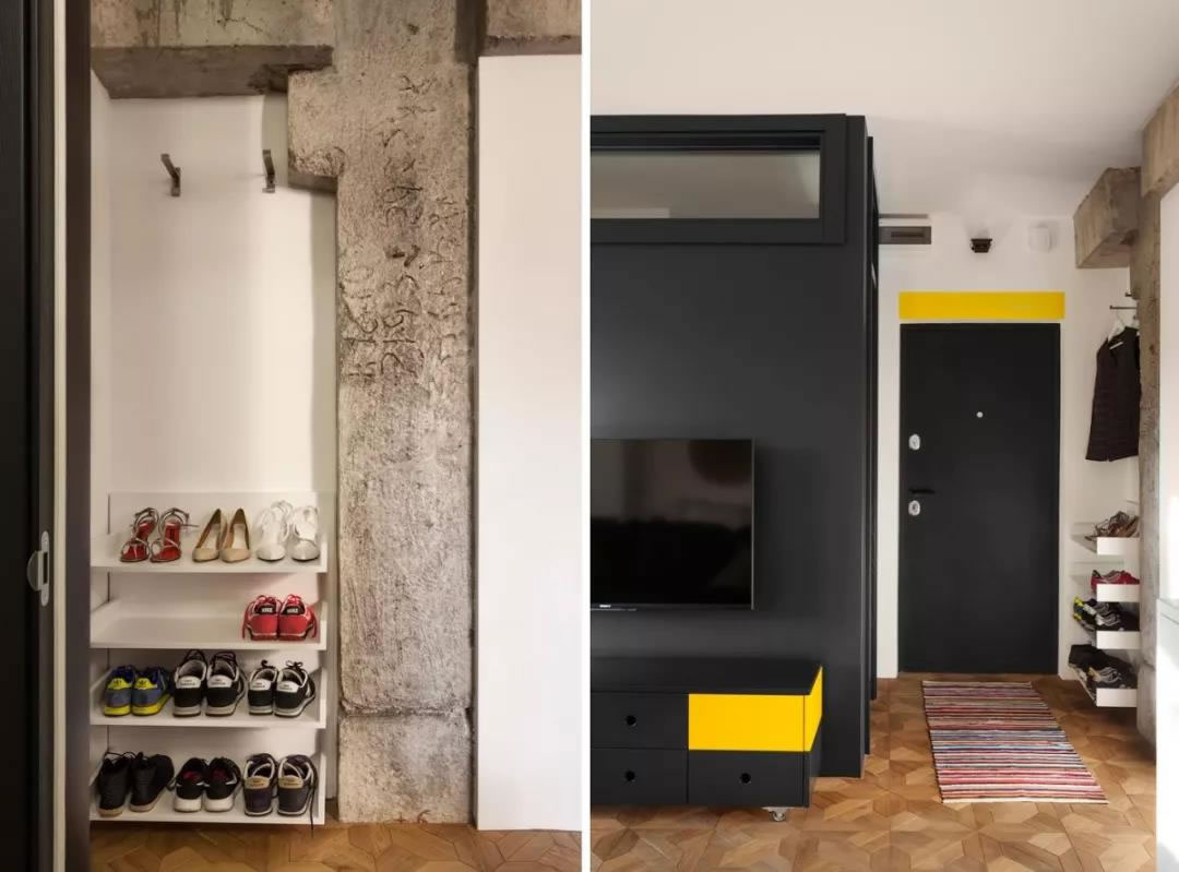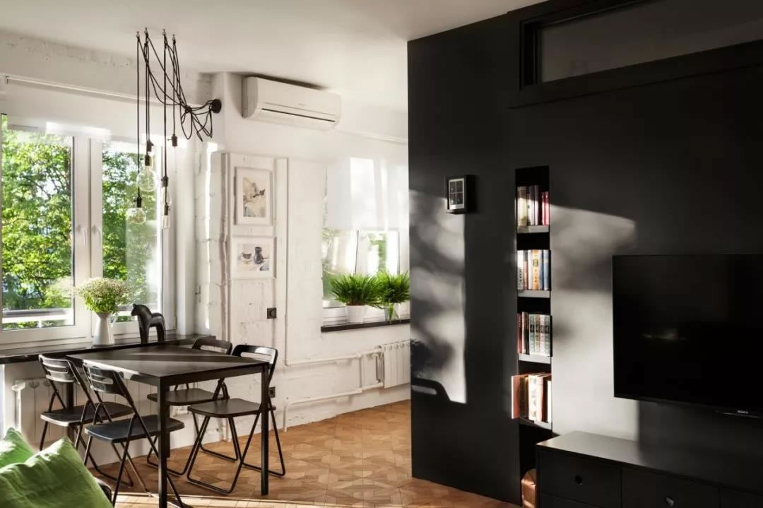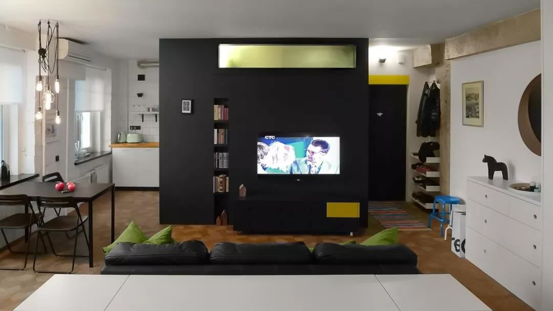 非常大膽的時(shí)尚公寓設(shè)計(jì),這套僅有43平方米的房子,給人留下深刻印象。以啞光黑色結(jié)構(gòu)為中心,在外面裝有娛樂(lè)系統(tǒng),然后它的內(nèi)部竟然隱藏了一個(gè)浴室??