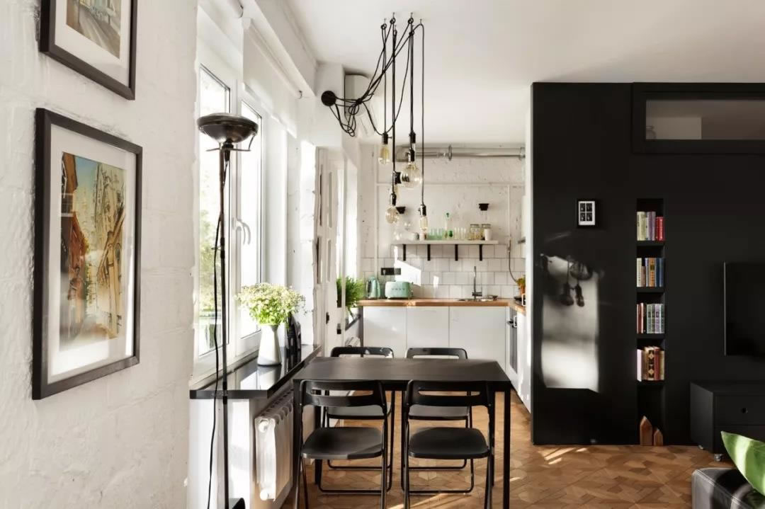 再來(lái)看看廚房,華麗復(fù)古風(fēng)格的家電。工業(yè)照明迎合了古董物件,高度可見(jiàn)的線畫(huà)容易吸引人的眼球,而愛(ài)迪生燈泡提供了一個(gè)柔和的光芒,完全不會(huì)有壓抑之感。