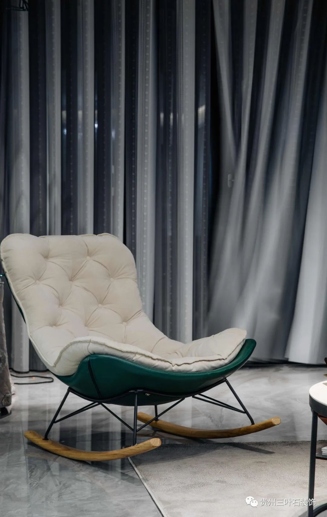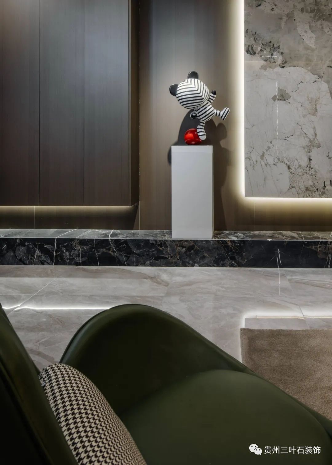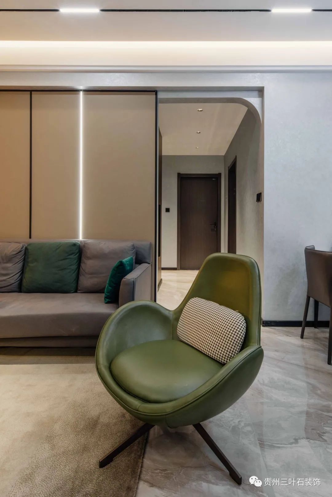 采取無(wú)主燈設(shè)計(jì),吊頂做磁吸軌道燈,黑色極窄軌道簡(jiǎn)潔,增加空間流動(dòng)感,同時(shí)在吊頂中暗藏?zé)魩ё鳛殚g接照明。主燈由三盞簡(jiǎn)燈代替,防眩暈簡(jiǎn)燈,光線柔和減少常規(guī)簡(jiǎn)燈射燈刺眼的問(wèn)題,盡可能節(jié)省層高空間營(yíng)造出寬敞開(kāi)闊的視覺(jué)感受。用純熟的線條技巧讓空間顯得利落輕盈,不同的墻面材質(zhì)豐富視角感官。搭配墨綠色的皮藝單人椅搭配灰色系毛絨地毯,奠定空間整體的沉穩(wěn)高級(jí)基調(diào)。